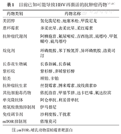 治疗方案可能影响宿主对病毒的免疫应答,因此也是HBV再激活的危险因素。蒽环类和类固醇类药物为HBV再激活的已知高危因素。曾有研究指出,类固醇药物可通过HBV基因组中的糖皮质激素应答元件直接刺激病毒复制而增加HBV再激活的风险。当然,这也取决于患者免疫抑制的程度[20,24]。阿仑单抗(alemtuzumab)及利妥昔单抗可耗竭循环中的B细胞,尤其是前者还可耗竭T细胞,从而导致机体抗HBV免疫失调,因而在HBsAg阴性/抗-HBc阳性的患者也可引起HBV再激活[17,25]。目前已知可能导致HBV再激活的抗肿瘤药物见表1。