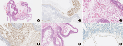 病理检查:大体检查:切除小肠肠管一段,长51 cm,周径5.0~7.5 cm,距一断端22 cm、另一断端27 cm处可见管腔狭窄,狭窄区肠腔直径约2 cm,部分黏膜皱襞粗大,并见多个息肉样隆起,直径0.2~0.8 cm,肠系膜侧见多个憩室,直径约0.2~1.3 cm,肠壁未见明显增厚,靠近狭窄处肠黏膜水肿,水肿黏膜面积5.5 cm×7.0 cm,余黏膜光滑。光镜观察:肠黏膜尚完整,黏膜及黏膜下层不规则隆起并突入肠腔(图1,图2),黏膜固有层慢性炎性细胞浸润,绒毛及隐窝结构规则,黏膜下层血管增多,走形迂曲,管腔不规则,管壁厚度尚均一,局灶见新鲜及陈旧性出血(图3,图4);隆起处黏膜下层见多个大小不等薄壁囊腔,囊腔互不交通,囊腔形态不规则,偶见于浆膜下层,直径最大达0.8 cm,囊壁由纤维组织包绕而成,囊壁腔缘侧可见较多组织细胞及多核巨细胞,未见上皮衬覆(图5,图6);囊腔与迂曲的血管交叉分布;多灶环形肌层中断,纵行肌层尚存,环形肌缺失处黏膜及黏膜下层疝入肠周脂肪组织,被覆薄层纵行肌或纤维组织,形成憩室状结构。免疫组织化学染色:不规则囊腔衬覆细胞CD68染色阳性,CD34、D2-40染色阴性,证实为组织细胞。