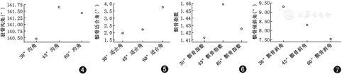 股骨沟角30°~45°显著增加,在60°时略微下降(图4)。适合角逐渐增加,屈膝45°~60°时,适合角显著升高(图5)。髌骨指数在45°呈现一峰值,从30°显著增加,而从屈膝45°到屈膝60°时,髌骨指数显著降低,而在不同屈膝角度的髌骨指数均>1,内侧髌骨关节面到滑车沟内侧面的最短距离始终大于外侧(图6);髌骨倾斜角从屈膝30°到屈膝60°时逐渐减小(图7)。