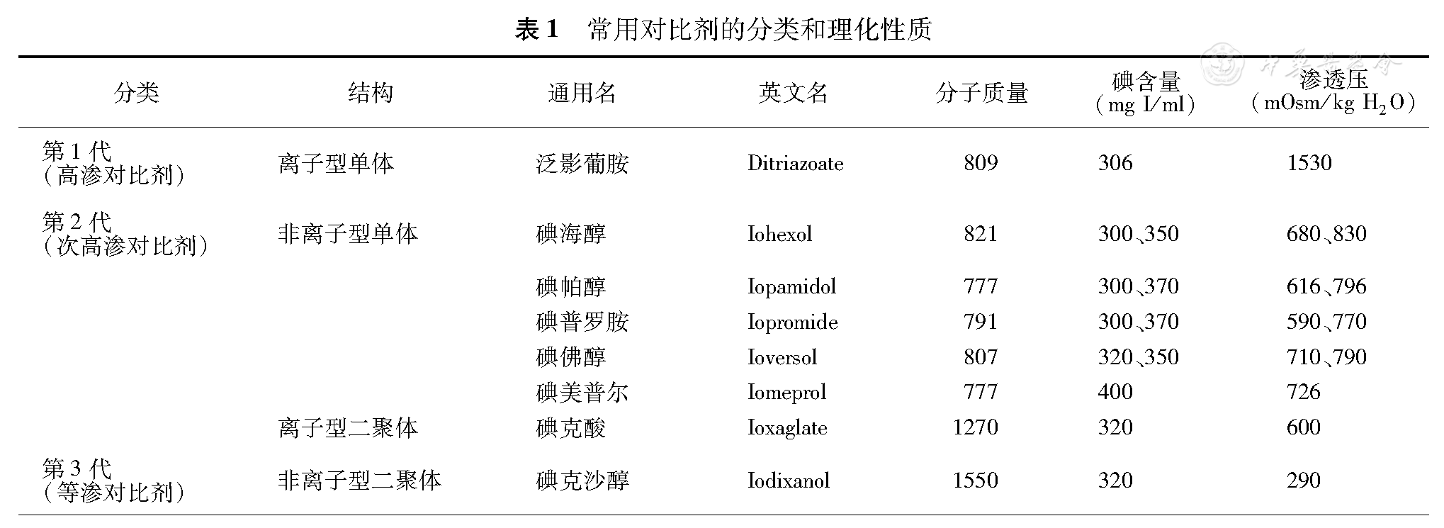 备注:本次修订用"次高渗"对比剂概念替代"低渗"对比剂概念。次高渗对比剂(原低渗对比剂)是相对高渗对比剂而言,而等渗对比剂是相对于血浆渗透压而言;事实上,次高渗对比剂的渗透压仍高于血浆渗透压的数倍(表1)[1,2]。