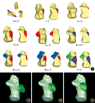 由于跟骨具有多关节面、承重以及形态极不规则等特点,因此跟骨关节内骨折的诊治一直是足踝外科医生研究的热点问题之一。精准的跟骨关节面重建内固定是决定跟骨关节内骨折治疗效果的关键因素,这就要求足踝外科医师必须在术前对骨折的关节面情况进行准确的评估与分型[5,6,7]。尽管跟骨骨折的分类方法较多,这些分类系统均可指导跟骨骨折的损伤严重程度、手术计划以及预后评估,而在所有的分型系统中,基于CT冠状面图像的Sanders分型系统对于足踝外科医师而言在一致性方面具有较高的稳定性[8]。即便如此,从2D CT图像上判断得到的Sanders分型在不同外科医师之间仍可存在一定比例的偏差,这在不同年资的外科医师之间可能更为显著。而Bhattacharya等[9]认为,Sanders分型即便是在高年资医师的分型判断结果一致性同样欠佳,其Kappa值也只有0.32。而造成这一结果的原因可能主要来自两方面:一方面,Sanders分型要求选择后关节面最宽部位以清楚显示载距突结构,这使得在2D CT图像阅片过程中由于分层层面的不恰当选取而容易出现偏差;另外一方面,跟骨本身形态极不规则的特点可能造成低年资外科医师在2D CT图像上无法形成骨折块之间清晰而直观的相对空间关系,对于骨折线的方向和数量判断也可存在偏差。因此,本研究运用数字骨科技术对跟骨骨折的Sanders分型进行了数字化建模,旨在为深入理解跟骨骨折的Sanders分型提供更为直观、高效和科学的手段。