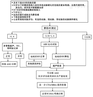 下肢ASO的诊断需要针对每位患者的具体情况进行综合分析,首先是危险因素的评估,如高龄、吸烟、高血脂、糖尿病以及其他部位是否存在动脉粥样硬化(如冠状动脉、颈动脉和肾动脉等)。然后通过病史询问和体格检查,初步确立下肢动脉硬化闭塞症的临床诊断。综合临床症状和体征,有助于判断肢体缺血的严重程度。通过节段性动脉压测定和ABI计算,可推断下肢动脉硬化闭塞的病变部位,推荐用于存在1项或1项以上ASO高危因素的可疑患者。将ABI≤0.9作为诊断阈值时,此项检查对血管直径狭窄率超过50%的病变有很高的诊断敏感性和特异性,但要警惕假性高压造成的漏诊(假性高压通常是指动脉硬化较为严重、血管钙化明显,测量血压时袖带不能将动脉压闭所导致测得的动脉压异常增高,最常见于糖尿病患者)。此外双侧锁骨下动脉或双上肢动脉狭窄/闭塞导致的上肢血压降低,如头臂干型大动脉炎患者,也可以导致ABI异常增高。因此,对于ABI>1.4的患者,需结合多普勒超声容积波记录和波形进行分析,少数特殊病例需要测定趾动脉压力和经皮氧分压以助诊断。ABI运动试验适用于下肢动脉搏动可及,踝肱指数基本正常(0.91~1.40),但与间歇性跛行等临床症状严重程度不相称的患者。如果ABI运动试验结果正常,可排除严重下肢ASO。如果运动后ABI显著下降,则可诊断下肢ASO。根据节段性压力和ABI测定的结果,可决定患者是否需要进一步的检查措施。