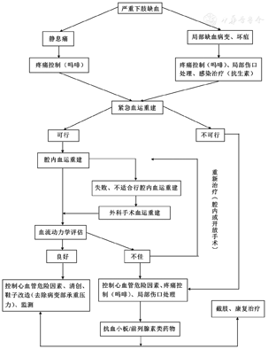 血运重建后要密切关注缺血再灌注损伤导致的局部和全身并发症,出现骨筋膜室(骨间隔)综合佂,应该及时行骨筋膜室切开减压。