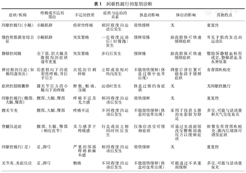 | 静脉性间跛 | 全下肢,但大腿及腹股沟的症状通常更重 | 突发紧痛 | 步行后发生 | 缓解慢 | 抬高肢体可快速缓解症状 | 髂股深静脉血栓形成史,静脉淤血及水肿征象 |