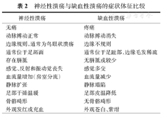 下肢出现缺血性静息痛、溃疡、坏疽等症状和体征,病程超过2周,严重程度取决于下肢缺血程度、起病时间以及有无诱发加重的因素。静息痛为在间歇性跛行基础上出现的休息时仍然持续存在的肢体缺血性疼痛。疼痛部位多位于肢端,通常发生于前足或足趾。静息痛在夜间或平卧时明显,患者需将患足置于特定位置以改善症状,如屈膝位或者将患足垂于床边。静息痛应与周围神经病变产生的疼痛相鉴别,后者常见于糖尿病和椎管狭窄患者。存在糖尿病周围神经病变的患者,振动觉和位置觉受损,反射减弱。椎管狭窄压迫神经根所引起的疼痛,在直立或后伸等体位变化时会进一步加重。患肢缺血持续加重可出现肢端溃疡,严重者发生肢体坏疽,合并感染可加速坏疽。缺血性溃疡多见于足趾或足外侧,任一足趾都可能受累,常较为疼痛。少数病例的溃疡可发生在足背。缺血性足部受到损伤,如不合脚的鞋子导致的摩擦或热水袋导致的烫伤,也可使溃疡发生在不典型的部位。除动脉供血不足外,足部溃疡还可能由其他多种病因引起。常见的有静脉性溃疡,多发生于下肢内踝上方(足靴区)。这种静脉血流淤滞所引起的溃疡,典型表现是溃疡周围湿疹和皮肤色素沉着。周围神经病变也可导致下肢溃疡的形成。由于代谢性疾病(如糖尿病)、肾功能衰竭、创伤或手术等因素导致外周神经受损,患肢保护性感觉丧失,局部压力负荷过大,在反复受到机械压力的部位可发生溃疡。神经性溃疡通常位于身体承重部位,有鸟眼状外观和较厚的胼胝。溃疡周围皮肤感觉丧失,无痛感,触诊足部温暖,肢体远端动脉搏动存在(表2)[4]。