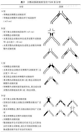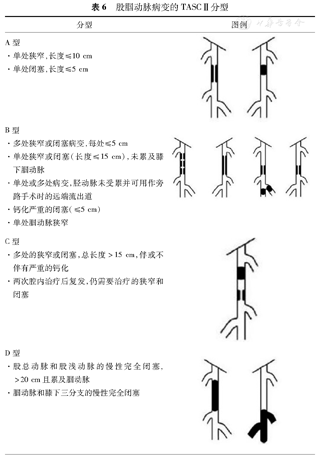 根据影像学检查所见动脉狭窄或闭塞程度,可按2007年第2版泛大西洋协作组(TASC)分型标准对主髂动脉病变和股腘动脉病变进行分型(表5,表6)[3],对临床治疗及预后具有指导意义。