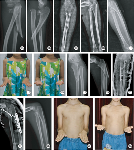 在处理桡骨颈骨折之前,先要对不稳定的尺骨骨折进行复位和固定[11]。上段骨折可选用钢板和克氏针,中上段交界区和中段骨折可选用钢板和髓内针。对于孟氏损伤,一些学者采取弹性髓内针技术固定尺骨骨折,取得了不错的疗效[13,14]。相对于钢板,采用弹性髓内针的切口小,不需要切开复位,不会破坏折端血运,并发症相对少[15]。术中使髓内针弧弓的方向与尺骨原始成角的方向相反,通过非对称的弯曲应力来矫正畸形,同时结合凹侧完整的骨外膜作为铰链,从而维持复位的稳定性。对于尺骨中段骨折,髓腔直径小,有利于预弯的弧弓发挥作用,固定效果最佳。尺骨中上段交界区为干骺端与骨干的移行部,髓腔较宽,入针点离骨折线近,难以达到"三点支撑"的原则,此处骨折的固定效果较差。对于头颈分离型损伤,由于桡骨颈与尺骨骨折不在同一水平,即使以两枚弹性髓内针固定双骨,也不符合六点支撑原理。一旦尺骨出现复位不良、或不稳定,还会影响桡骨颈骨折的复位。Faundez等[3]报道1例,尺骨骨折位于中段,双骨均采用弹性髓内针固定,随访6个月,愈合和功能均满意。本组尺骨骨折采用弹性髓内针固定3例,中段骨折1例,复位效果为优;中上段交界区骨折2例,固定后均出现5°~10°成角,复位效果为良。这2例中,1例桡骨颈骨折单纯切开复位未予固定,复查时发生再移位。另1例双骨均采用弹性髓内针固定,虽然桡骨颈骨折顺利愈合,但干骺端出现增生膨大,前臂旋转活动轻度受限,旋前40°,旋后85°(图2)。干骺端膨大很可能与骨折固定不稳有关。处理此类严重损伤时,要想获得满意的复位并维持稳定,尺骨骨折固定必须牢靠。本组8例采用切开复位钢板固定尺骨骨折,无一例发生对位对线不良、再移位等并发症。