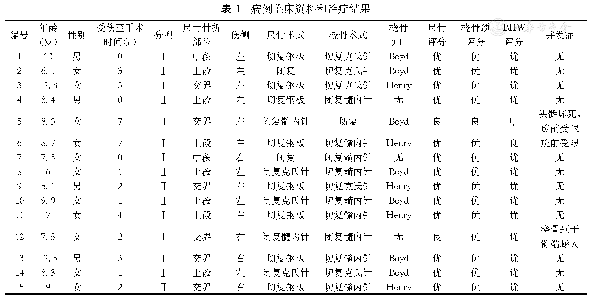 本组男4例,女11例。受伤时的年龄5.1~13.0岁(平均8.7岁)。左侧11例,右侧4例。根据尺骨骨折成角方向和桡骨近侧干骺端移位方向分为两型:Ⅰ型(伸直外翻型)定义为尺骨骨折端向尺掌侧成角,桡骨近侧干骺端向尺掌侧移位(图1),共9例。Ⅱ型(屈曲内翻型)与Ⅰ型相反,成角和移位方向均指向桡背侧(图2),共6例。按尺骨的骨折部位划分:尺骨上段7例(Ⅰ型4例,Ⅱ型3例),中上段交界区6例(Ⅰ型3例,Ⅱ型3例),中段2例(Ⅰ型2例)(表1)。尺骨上段骨折为不全骨折,移位不大,骨折线不规则,伴有纵裂;尺骨中段和中上交界区骨折移位明显,多为短斜形骨折(短斜形7例,长斜形1例)。按桡骨颈骨折线位置划分,所有病例均为干骺端骨折,未累及近端骨骺及骺板。开放骨折1例(Ⅰ型),为尺骨骨折导致的GustiloⅠ型损伤。合并成骨不全1例(Ⅱ型)。伴桡神经损伤1例(Ⅱ型)。致伤原因包括:行走或奔跑时摔伤3例,坠床或高处坠落伤7例,自行车和滑板等运动损伤4例,车祸伤1例。就诊时拍摄以肘关节为投照中心、包括前臂全长的正侧位X线片和肘部CT;牵引下恢复肢体力线,以石膏托临时制动。受伤至手术的时间为0~7 d(平均2.4 d)。