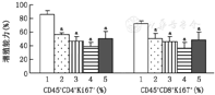 将hUC–MSCs–ex处理前后的PBMC,分别标记CD4–FITC, CD8–APC膜抗体,破膜后再加入Ki–67–PE及IgG1–PE同型对照抗体,上机流式检测分析CD4+T、CD8+T细胞中Ki–67的表达。