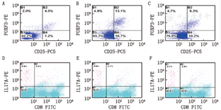1×106/孔PBMC种植于6孔板,加入CD3/CD28单抗刺激,然后将不同浓度的hUC–MSCs–ex(1, 5, 10 μg/106 PBMC)加入到6孔板中,同时设置空白组,和hUC–MSCs–ex共培养组,共培养3 d后,收集细胞。流式检测共培养前后Treg/Th17细胞比例的变化。
