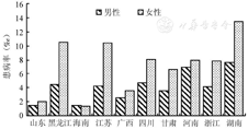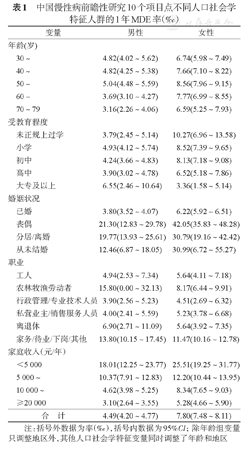 本研究结果提示,不同人口社会学特征,如女性、婚姻状况(未婚、离婚或丧偶)、职业人群(如离退休、下岗待业人员、从事家务等人群)以及低家庭收入为MDE的危险因素,与国内外已有研究结果一致[8,14,15]。本研究还显示,不同性别的一些特定职业人群,如男性私营业主、销售服务人员,以及女性农林牧渔劳动者、管理人员和专业技术人员,可能面临较大的工作或生活压力,也是抑郁高发人群。此外,本研究也显示,不同项目地区MDE的1年患病率存在显著差异,这可能与10个项目地区经济发展水平和上述人口学特征构成有关。但也有研究指出,除了不同国家和地区患病水平的差异外,DSM标准可能在不同人群中诊断MDE病例的严重程度不同,从而出现不同地区的患病水平的差异[8,16]。