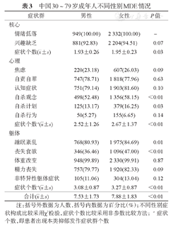 共有3 281人(6.40‰)在过去1年内有MDE。性别、婚姻状况、职业和家庭收入等与MDE有关。在3 281名MDE患者中,躯体化症状明显,以体重改变、睡眠紊乱和精力丧失为主(分别为99.91%、83.60%和81.59%)。女性患者各症状出现的比例和数目均高于男性(P<0.05)。发作后仍有约1/3的患者没有寻求过社会支持和心理治疗,抗精神病药物的使用率仅为8.99%。