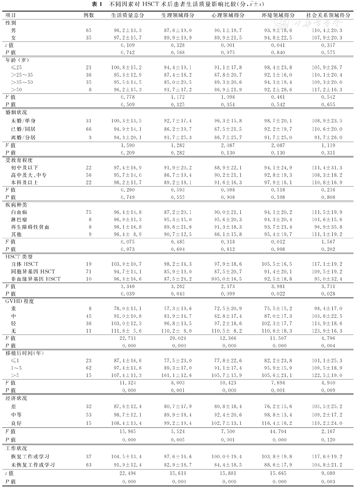 造血干细胞移植(hematopoietic stem cell transplantation,HSCT)泛指患者接受超剂量放、化疗后,将各种来源的正常造血干细胞通过静脉输注移植入患者体内,以替代原有的病理性造血干细胞,从而恢复患者正常造血及免疫功能,达到疾病临床治愈目的[1]。HSCT现已成为根治恶性血液病、恶性实体瘤等疾病的主要治疗手段之一。随着接受HSCT患者长期生存率的增高,其术后生活质量亦愈来愈受到重视[2]。本研究通过对HSCT术后患者生活质量现状进行调查,分析其相关影响因素,为医疗护理干预提出指导性建议。现将研究结果报道如下。