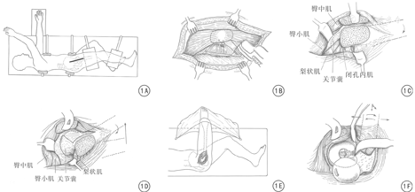 自大转子前缘纵行切开关节囊,近端自髋臼缘向后延长、远端沿关节囊止点向前下方延长,呈"Z"形。由内向外切开关节囊(图1D),避免损伤股骨头软骨、髋臼盂唇等。