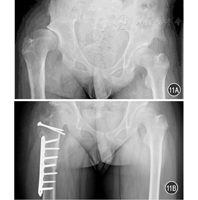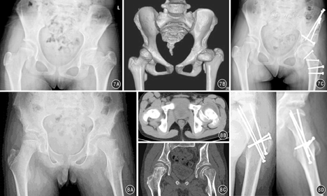 8岁以上大龄髋关节脱位处理极为棘手。对于双侧脱位患者肢体平衡,仅有鸭步和腰椎前凸,无痛情况下自身髋关节可以使用很长时间,故不建议手术干预。但单侧髋关节脱位将合并严重的肢体不等长、跛行、继发脊柱侧凸、继发膝外翻等严重并发症,可以考虑积极处理。既往采用假臼造盖、Chiari骨盆内移截骨等方法治疗,长期效果不很理想[28]。新近采用的骨盆支撑截骨术治疗,虽然能够取得一定效果,但长期疗效欠佳,并给后期全髋关节置换造成较大的困难[29,30]。2012年,Ganz等[31]通过SHD对Colonna关节囊成型手术进行改良,部分患者取得了长期的"几乎正常"的临床效果。