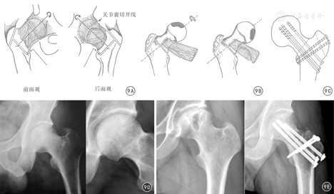 Sugioka[26]于1978年设计了针对早期股骨头坏死的股骨颈基底部旋转截骨术,后经多人改良,但保髋的临床效果参差不齐(图9A,图9B,图9C)。张洪等[27]在对股骨头血运充分掌握的基础上,再次进行了改良,对北美骨循环协会(Association Research Circulation osseous, ARCO)Ⅱ期和ⅢA、ⅢB期的患者,先通过SHD行股骨颈软组织瓣延长,再进行股骨颈基底部旋转截骨手术,使股骨头可以向前旋转、也可以向后旋转90°~180°,将股骨头坏死区域旋转到非负重区,取得更大更灵活的旋转角度,避免股骨头血运进一步损害,避免股骨头的塌陷,从而取得长期的保髋治疗效果(图9D、图9E)。