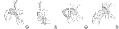 改良Colonna关节囊成型的技术要点包括:通过SHD显露髋关节,保护股骨头血运;将关节囊从髋臼缘完整分离,修整后完整包裹股骨头;在真性髋臼部位磨挫制作髋臼至适当大小;将股骨头还纳,维持在稳定位置;必要时进行Stahli造盖、股骨颈相对延长、股骨短缩/去旋转截骨。见图10、图11。该手术操作复杂,技术要求很高,康复时间长,并发症较多,短期内谨慎开展。