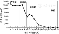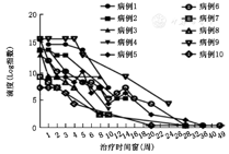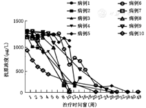 按2010年美国感染性疾病协会(IDSA)隐球菌病治疗指南[7]对本院住院和随访的隐脑患者进行治疗。对本院初治的10例隐脑患者进行荚膜抗原半定量和定量检测。乳胶凝集试验半定量检测结果表明:随着治疗时间的延长,荚膜抗原滴度总体逐渐下降(图1)。10例初治隐脑患者治疗前脑脊液荚膜抗原滴度分布在1∶128~1∶65 536,诱导期治疗结束时抗原滴度分布在1∶4~1∶16 384。ELISA法进行荚膜抗原定量动态检测发现:荚膜抗原原浓度总体也呈下降趋势,与半定量检测结果类似(图2)。治疗前脑脊液荚膜抗原浓度分布在(861~1 267)μg/L,诱导期治疗结束时荚膜抗原浓度分布在(135~1 216)μg/L。