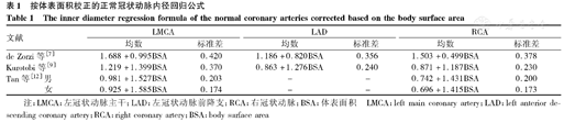 注:LMCA:左冠状动脉主干;LAD:左冠状动脉前降支;RCA:右冠状动脉;BSA:体表面积 LMCA:left main coronary artery;LAD:left anterior descending coronary artery;RCA:right coronary artery;BSA:body surface area