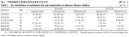 The distribution of nutritional risk and malnutrition in different diseases children[n(%)]