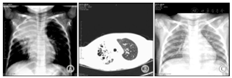 注:A:2010-03-31胸片示右上肺大片状密度增高影;B:2010-04-12肺CT示右下肺背段多个厚壁空洞;C:2010-06-21胸片示右侧肺炎症基本吸收