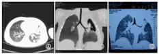 注:A:2010-02-08 CT示左上肺脓肿;B:2010-02-08 CT示左上肺脓肿(冠状位);C:2011-07-18 CT示左上肺部分肺不张、条索影,左下肺代偿性肺气肿