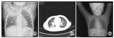 4例患儿经上述治疗后均于3~5 d体温恢复正常,咳嗽减轻,肺部体征逐渐好转。应用大环内酯类抗生素治疗后复查胸片示肺炎大部分吸收好转。目前随访6~18个月,均预后较好,无慢性咳嗽及反复喘息症状,肺部听诊无阳性体征,复查胸片或CT示肺炎均已吸收。仅例2仍有左上肺局限肺不张,左下肺代偿性肺气肿。未见支气管扩张、闭塞性毛细支气管炎等并发症。