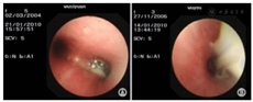 3例患儿支气管黏膜充血水肿,部分支气管黏膜检散在分布小结节,病变部位支气管开口处淡黄色黏稠痰液堵塞,见图5。