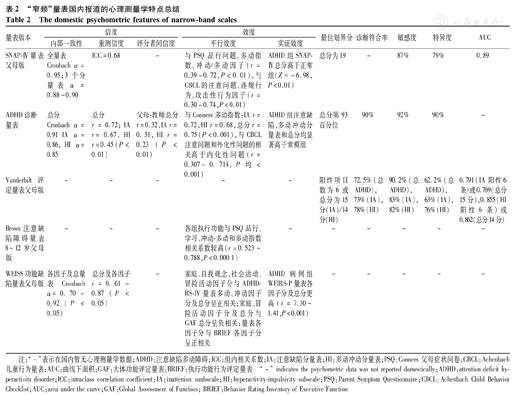 注:"-"表示在国内暂无心理测量学数据;ADHD:注意缺陷多动障碍;ICC:组内相关系数;IA:注意缺陷分量表;HI:多动冲动分量表;PSQ:Conners父母症状问卷;CBCL:Achenbach儿童行为量表;AUC:曲线下面积;GAF:大体功能评定量表;BRIEF:执行功能行为评定量表 "-"indicates the psychometric data was not reported domestically;ADHD:attention deficit hyperactivity disorder;ICC:intraclass correlation coefficient;IA:inattenion sunbscale;HI:hyperactivity-impulsivity subscale;PSQ:Parent Symptom Questionnaire;CBCL:Achenbach Child Behavior Checklist;AUC:area under the curve;GAF:Global Assessment of Function; BRIEF:Behavior Rating Inventory of Executive Function