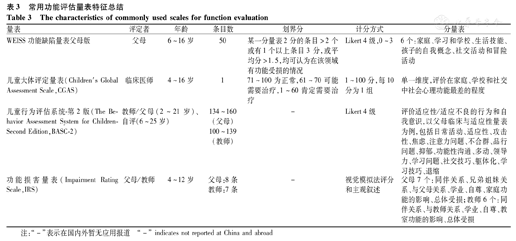 | WEISS功能缺陷量表父母版 | 父母 | 6~16岁 | 50 | 某一分量表2分的条目>2个或有1个以上条目3分,或平均分>1.5,均可认为在该领域有功能受损的情况 | Likert 4级,0~3 | 6个:家庭、学习和学校、生活技能、孩子的自我概念、社交活动和冒险活动 |