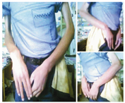 先证者,女,现4岁5个月,第1胎第1产,足月剖宫产(脐带绕颈),出生后无窒息。自幼哭声弱,无喂养困难,3个月抬头,7~8个月独坐,1岁会说简单话,15个月会走路,步态异常,腰椎前凸,易摔跤,下蹲后起立困难,不能独自上下楼梯,跑跳差。3岁时就诊于北京大学第一医院。体检:心肺腹未见明显异常。神经系统:神志清楚,轻度脊柱强直,轻度漏斗胸,肋缘外翻,Gower征阳性,四肢肌力低,以双上肢近端及双下肢远端明显,肌张力稍低,肌容积少,双侧膝腱反射减弱,病理征阴性。查血清肌酸激酶427 IU/L,肌电图示肌源性损害。ECG示窦性心律不齐,心脏彩超未见异常。先证者父亲有相同症状,现37岁,1岁会走路,易摔跤,病情呈缓慢进行性加重,渐出现四肢对称性肌无力、肌萎缩,约4岁开始出现肘关节挛缩,20岁左右开始感运动后胸闷,31岁发现窦性心动过缓,现步行能力明显下降,一次只能步行约500 m。查体:心率36次/min;脊柱侧弯,颈部僵硬,低头受限,肘关节挛缩,见图1;全身明显肌萎缩,跟腱紧,双膝腱反射及跟腱反射未引出,病理征阴性。查肌酸激酶293 IU/L。ECG示窦性心动过缓(心率36次/min)。通过家系分析提示该家系符合常染色体显性遗传。本研究获得患者家属的知情同意,并经医院伦理委员会讨论通过。