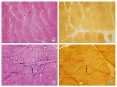 取患儿腓肠肌进行开放性活检,所取组织经异戊烷预冷后在液氮中冷冻固定,冷冻切片,片厚6 μm,常规进行组织学染色及酶组织学化学染色。