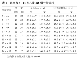 选取中心城区中小学、幼儿园,年龄5~14岁健康儿童,每1岁为1个年龄组,共10个年龄组,每个年龄组中,男、女童各约20例。