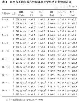 北京市不同年龄和性别儿童主要肺功能参数测定值(