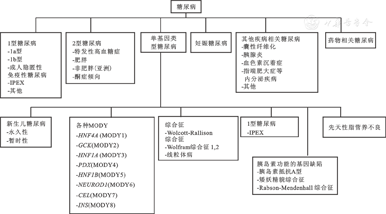 注:IPEX:X连锁多内分泌腺病肠病伴免疫失调综合征;MODY:青少年发病的成人型糖尿病;HNF4A:肝细胞核因子-4A;GCK:葡萄糖激酶;HNF1A:肝细胞核因子-1A;PDX:胰腺十二指肠同源盒;HNF1B:肝细胞核因子-1B;NEUROD1:神经元性分化因子1;CEL:羧基酯脂肪酶;INS:胰岛素基因 IPEX:immunodeficiency polyendocrinopathy and enteropathy X-linked syndrome;MODY:maturity-onset diabetes of the young;HNF4A:hepatocyte nuclear factor-4A;GCK:glucokinase;HNF1A:hepatocyte nuclear factor-1A;PDX:pancreatic and duodenal homeobox;HNF1B:hepatocyte nuclear factor-1B;NEUROD1:neuronal differentiation 1;CEL:carboxyl ester lipase;INS:insulin