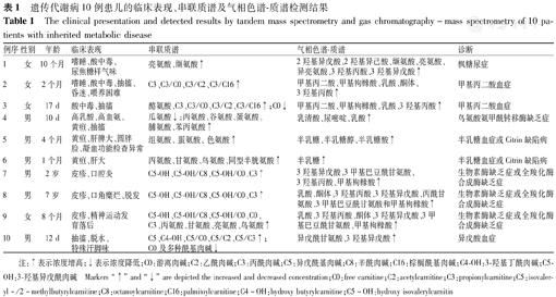 The clinical presentation and detected results by tandem mass spectrometry and gas chromatography-mass spectrometry of 10 patients with inherited metabolic disease