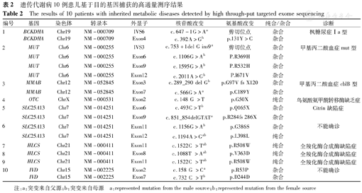 10例患儿的高通量测序结果及其父母的Sanger测序结果见表2。例1枫糖尿症致病基因中的BCKDHA基因发生2个杂合突变,生物学分析均提示有害,提示该患儿是枫糖尿症Ⅰa型。例2甲基丙二酸血症致病基因中的MUT基因发生4个杂合突变,生物学分析4个突变均提示有害,提示该患儿是甲基丙二酸血症mut型。例3甲基丙二酸血症致病基因中的MMAB基因发生2个杂合突变,生物学分析其均提示有害,提示该患儿是甲基丙二酸血症cblB型。例4鸟氨酸氨甲酰转移酶缺乏症的致病基因OTC发生1个纯合突变,生物学分析其均提示有害。例5 Citrin缺陷症的致病基因SLC25A13发生2个杂合突变生物学分析其均为有害。例6 Citrin缺陷症的致病基因SLC25A13发生1个杂合突变和1个纯合突变,生物学分析其杂合突变为致病性突变,而另1个为同义突变,理论上不能确诊患儿患有Citrin缺陷症。例7和例9均在全羧化酶合成酶缺陷症的致病基因HLCS中发现相同的纯合突变c.1522C > T,生物学分析为致病性突变。例8全羧化酶合成酶缺陷症的致病基因HLCS发生1个纯合突变,生物学分析为致病性突变。例10异戊酸血症的致病基因IVD发生2个杂合突变,生物学分析c.158 G > C为致病性突变,而c.732 C > T为同义突变,理论上不能确诊患儿患有异戊酸血症。