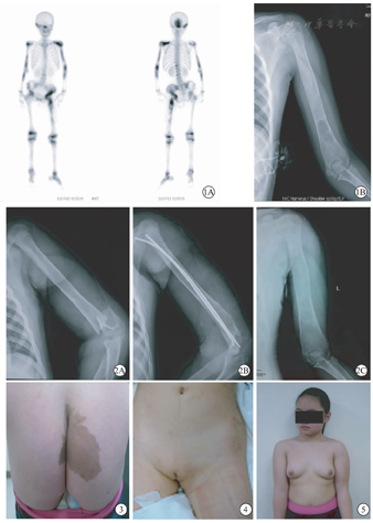 常表现为单发或多发性骨纤维结构不良,(fibrous dysplasia of bone,FD),是以骨的纤维组织增生,伴骨化不全为病理特点的良性骨肿瘤。多在儿童期发病,伴内分泌功能障碍时以多骨型更多见。骨受损出现时间较早,任何骨均可受累,有文献报道50%的骨损害出现在8岁左右[13]。多呈不对称性分布,颅骨、上下颌骨及股骨上干骺部,发生频率最高,其次脊柱、骨盆、长骨骨干、干骺端甚至骨骺等也有受累的报告(图1,图2,图3,图4,图5为作者亲自治疗的典型McCune-Albright综合征病例)[14]。FD发生在颅面骨时常病情发展缓慢,症状、体征不明显,但病变累及颅底并过度增生时,可导致脑神经孔受压,如视神经、听神经受压可致视听力下降甚至失明、失聪的严重后果。如上下颌骨受累可致鼻腔通气、上消化道吞咽功能受阻及颜面毁损,甚至受到生命威胁[15]。FD如发生在肢体骨骼,早期或轻型病变往往缺乏症状和体征,发生病理骨折后,才出现症状和体征,如疼痛、跛行、活动受限等[16]。骨折年龄在4~9岁最常见,随年龄增长,病变可趋向静止,但不包括头面骨。发生在脊柱的FD可以因脊柱后突侧弯,或椎体病理性压缩骨折而就诊,也有因病损向椎管内扩展发生脊髓、神经根受压症状如运动及感觉障碍、肢体瘫痪、患区疼痛等[17]。