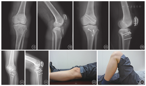 患者取仰卧位,麻醉满意后取膝关节前方正中切口,依次切开皮肤和深筋膜,暴露髌韧带及胫骨结节,可见骨折片自胫骨结节连同胫骨近端少量骨质向近端延伸至胫骨平台前缘,未累及胫骨平台关节面,撕脱骨折块受髌韧带牵拉向近端移位,旋转移位不明显。伸直膝关节,复位骨折,应用3枚空心螺钉固定,使用髌钳复位髌骨下极骨折,并用张力带固定(图2A,B)。屈伸膝关节检查见骨折片固定牢固,无移位。缝合伤口,2周后拆线,伤口甲级愈合。术后即指导患者进行膝关节功能锻炼,患侧膝关节活动范围可达到0~120°。术后6个月随访,X线片示胫骨结节及髌骨下极骨折一期愈合(图3A,B),患者膝关节伸屈活动度良好(图4A,B),已回到伤前工作岗位工作。