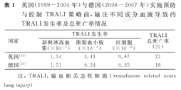 英国(1999-2004年)与德国(2006-2007年)实施预防与控制TRALI策略前,输注不同成分血液导致的TRALI发生率及总死亡率情况