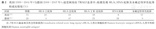 1985年,Popovsky等[5]研究结果显示,TRALI发生率为20/10万,然而TRALI发生率与献血人群结构、血液制品种类,以及采供血机构是否实施TRALI预防控制策略等密切相关。英国(1999-2004年)和德国(2006-2007年)于实施TRALI预防控制策略前,输血患者接受新鲜冰冻血浆(fresh frozen plasma,FFP),浓缩血小板(platelet concentrate,PC)及红细胞输注时,导致的TRALI发生率依次降低,见表1。超过80% TRALI是由HLA-Ⅰ及-Ⅱ抗体及HNA抗体所致。英国(1999-2004年)和德国(2006-2007年)临床发现的TRALI病例中,检测发现特异性HLA、HNA抗体及未确定特异性抗体的构成比,见表2。不同抗体导致的TRALI,严重程度不相同,含有HNA-3a抗体及同时含有HLA-Ⅰ及-Ⅱ抗体的患者接受输血治疗后,发生TRALI的死亡风险较高[16]。输注有多次妊娠史的女性献血者血液,导致输血患者产生HLA和HNA抗体的几率较大。Triulzi等[17]对7 841例献血者询问妊娠史和输血史,并进行白细胞抗体筛查的研究结果表明,有妊娠史的女性献血者HLA抗体检出率为11.2%~32.2%,显著高于男性和无妊娠史女性献血者HLA抗体检出率(<2%)。Gottschall等[18]对1 171例献血者HNA抗体进行筛查的结果显示,HNA抗体检出率为0.7%(8/1 171)。因此,采供血机构于采供血环节预防TRALI发生的策略应包括,避免采集有多次妊娠史女性献血者的血浆或血浆含量高的血液制品,即使需采集,也应于采集前进行血液HLA抗体筛查。目前,英国、荷兰、美国等多个国家已经实施血浆含量高的血液制品应主要来源于男性献血者,对采集有妊娠史女性献血者血液时,应筛查血液HLA抗体,以达到预防、控制TRALI的目的。