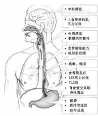 导致胃食管反流发生的机制包括:食管裂孔疝、下食管括约肌(LES)异常、一过性LES松弛(TLESR)、胃食管交界部松弛增宽、酸袋、肥胖、食管清除延长、胃排空障碍等,另外,引起腹压增高的咳喘等呼吸道症状也是导致或加重反流的重要原因。导致食管症状综合征的可能机制:反流酸度、近端扩张、反流物含气、十二指肠胃食管反流、食管纵形肌收缩、黏膜完整性,以及外周和中枢感觉等[14](图2)。另外广泛开展的对抗反流屏障造成破坏和增加反流的上消化道外科手术可造成大量的医源性反流病[15]。