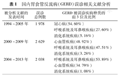 | 被分析文献的发表时间 | 误诊总例数 | GERD被误诊疾病种类的前3位及比例 |