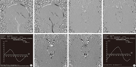 矢状位PC-Cine序列示在一个心动周期内桥前池、延前池、中脑导水管、四脑室内CSF呈渐明渐暗的循环变化,心脏收缩期峰流速方向向下,舒张期方向向上,峰流速曲线为规则或基本规则的正弦或余弦曲线。