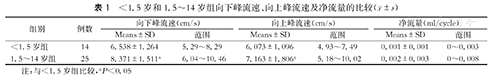 <1.5岁和1.5~14岁组向下峰流速、向上峰流速及净流量的比较(