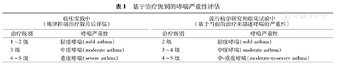 | 临床实践中(规律控制治疗数月后评估) | 流行病学研究和临床试验中(基于当前的治疗来描述哮喘的严重性) | ||