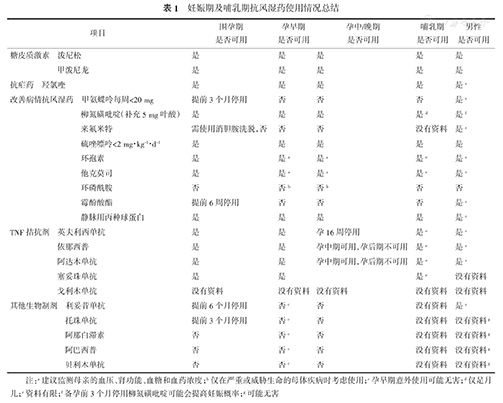 育龄期女性和男性是SLE、RA和AS等多种风湿病的主要发病人群,且活动性风湿病与不良妊娠结局相关[1]。随着我国计划生育政策的转变,相信不久会有越来越多的风湿病患者面临着疾病药物治疗与安全妊娠的双重困惑。为此,风湿科医生如何指导患者在妊娠前、妊娠中、哺乳期及男性备孕期安全使用抗风湿病药物显得尤为重要。既往曾有一些有关妊娠期如何安全使用抗风湿病药物的零星报道[2,3],但因生育期用药的特殊性、临床用药证据的不断积累及新药的不断上市与使用,有必要及时对既往的信息进行更新,并制定生育期用药的相关推荐意见。近期,英国风湿病学会和风湿病健康专家就妊娠期和哺乳期如何安全使用生物或传统改善病情抗风湿药制定了最新的使用指南,并发表在2016年1月Rheumatology杂志上,具体见下文及表1。