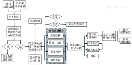 急诊为绿色通道患者提供先诊疗后结算服务。检验科对标有"绿色通道"标识的申请单及标本快速反应,并在规定时限内完成。医学影像检查30分钟内出具报告;床旁检查10分钟内到达床旁,检查完毕后立即出报告。药剂科对标有"绿色通道"标识的处方快速反应,制定紧急情况下临时借药制度,优先满足患者需要。