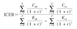 式中,A、B分别代表参比策略和研究策略,EtA、EtB和CtA、CtB分别表示参比策略和研究策略在第t年的效果和成本,T表示期望寿命;r表示年贴现率。