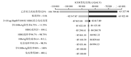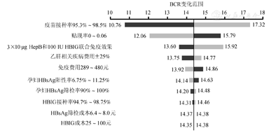 在乙肝母婴阻断策略CBA中,疫苗接种率是最重要的影响因素(图2),当接种率降低至95.3%或增高至98.5%时,BCR可由基线水平时的14.37波动在10.76~17.32之间。该结果提示,尽管需要联合注射HBIG,但保持乙肝疫苗接种高水平覆盖,仍然为策略实施的重要指标。其他影响因素依次为贴现率、免疫效果、乙肝相关疾病费用和免疫预防费用,而孕妇HBsAg阳性率、孕妇HBsAg筛检率和筛检费、HBIG接种率和成本对研究策略的影响较小。